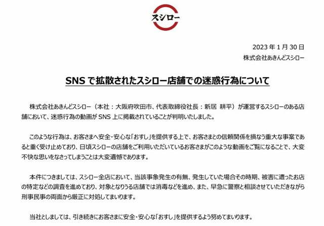 スシロー 刑事と民事の両面で厳正に対処 snsに掲載された 迷惑行為動画 めぐり Mbsニュース